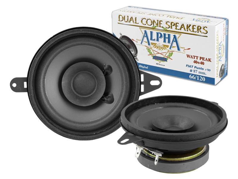 Komplet głośników 1-drożnych włoskiej firmy Phonocar z serii ALPHA 87 mm. Przeznaczony do FIATA PUNTO oraz >9/99-MAREA oraz innych z montażem 87 mm