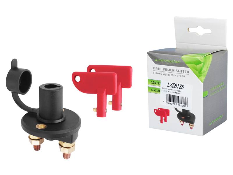 Wyłącznik służący do szybkiego odłączania zasilania w pojazdach. Może z powodzeniem pełnić funkcję dodatkowego zabezpieczenia antykradzieżowego. Wyłącznik aktywowany za pomocą specjalnego kluczyka, dwa kluczyki w zestawie. Do zastosowania w pojazdach zasilanych prądem stałym 12/24 V. Maksymalne obciążenie 300 A.