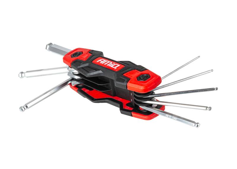 Składany zestaw 8 kluczy imbusowych HEX z kulką, wykonany z odpornej stali chromowo-wanadowej (CR-V). Konstrukcja ball point umożliwia pracę pod kątem, a forma scyzorykowa zapewnia kompaktowość, wygodne przenoszenie i szybki dostęp do potrzebnego rozmiaru. Zestaw przeznaczony do zastosowań serwisowych, montażowych i instalacyjnych.Cechy i parametry: