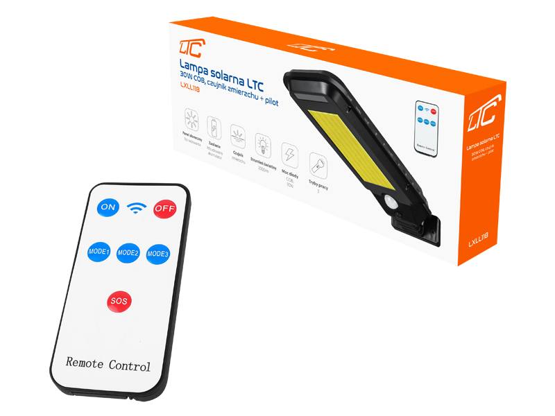 Lampa solarna LTC 30 W COB, 2000 lm, sensor ruchu i zmierzchu, akumulator 2400 mAh + pilot.