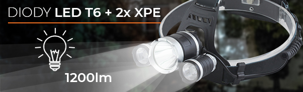 Latarka czołowa LTC 3-LED T6 1200lm,akumulator 2x18650,ładowarka sieciowa,samochodowa, 4-stopniowa regulacja.