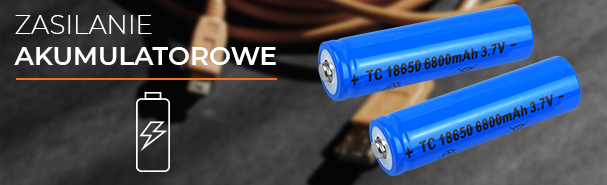 Produkt zasilany jest dwoma akumulatorami Li-Ion 18650 (dołączone do zestawu). Zastosowanie takiego źródła zasilania umożliwia wielogodzinne korzystanie z latarki bez potrzeby ładowania. W przypadku rozładowania latarkę wystarczy podłączyć do adaptera sieciowego lub ładowarki samochodowej (akcesoria w zestawie).