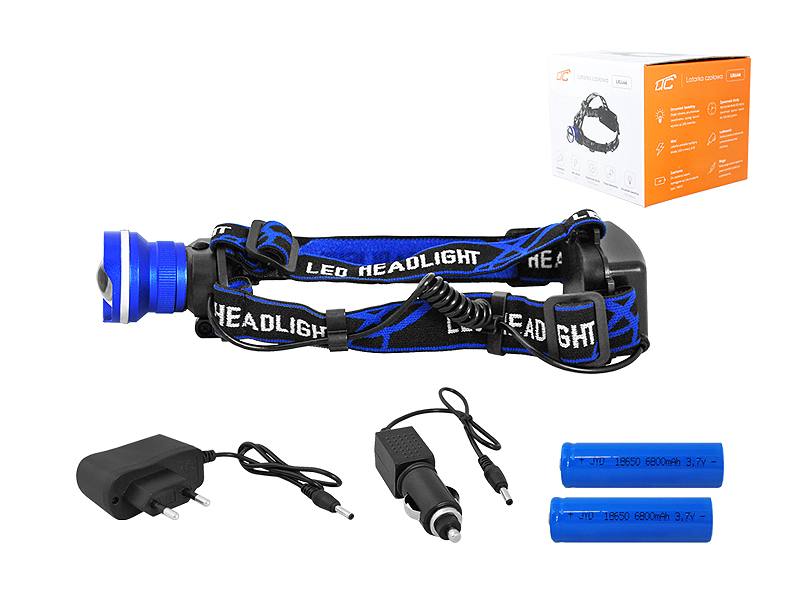 Latarka czołowa LTC LL46, T6, Zoom, aluminiowa, zestaw ładowarki sieciowej i samochodowej, czarno-niebieska.