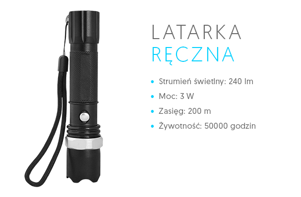 Niewielka, fantastycznie wykonana latarka ręczna. Latarka ta, ilością światła zachwyci każdego użytkownika. Zastosowanie bardzo mocnej diody oraz funkcja zoom, pozwala na osiągnięcie bardzo mocnego strumienia świetlnego, którego zasięg to aż 200 metrów.