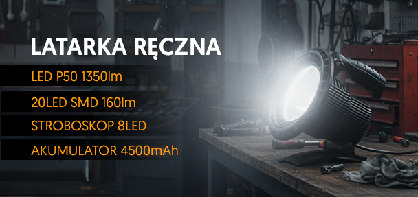 LATARKA RĘCZNA SZPERACZ, LED P50 1350LM+20LED SMD 160LM, STROBOSKOP 8LED(4LED SMD CZERWONE+ 4LED SMD NIEBIESKIE), AKUMULATOR 4500MAH