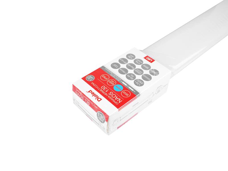 Oprawa Naos o klasie szczelności IP65 i mocy 36W. Świeci białym, zimnym światłem o jasności 4680lm. Długość oprawy wynosi 65 cm. W oprawie zastosowano diody LED o żywotności aż 30000h. Charakterystyczną cechą produktu jest jasność na poziomie 130lm z 1W mocy oraz gniazdo szybkiego montażu które jednocześnie umożliwia łączenie liniowe lamp.