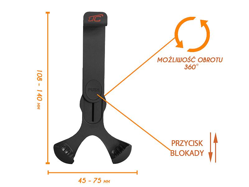 Uchwyt pasuje do większości smartfonów dostępnych na rynku i rozszerza się do szerokości aż 140 mm, co pozwala na jego dostosowanie do wielu różnych modeli urządzeń. Element trzymający urządzenie został zamocowany na obrotowej główce co umożliwia swobodny obrót urządzenia, znajdującego się w uchwycie, o 360 stopni. Dodatkową cechą zwiększającą komfort użytkowania, jest elastyczna szyjka, którą można wyginać w dowolny sposób. Przyssawka z żelem pozwala na zamocowanie uchwytu niemalże na każdej powierzchni, zarówno na szybie samochodu jak również na desce rozdzielczej naszego auta.