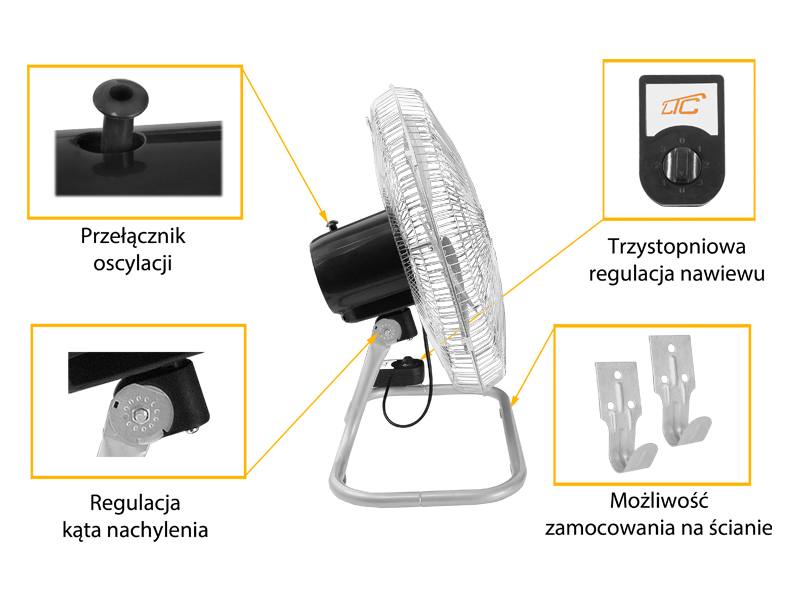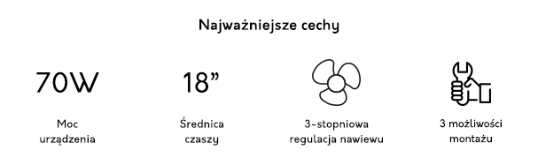 Duża moc, aerodynamicznie skonstruowane śmigło, trzystopniowa regulacja prędkości nawiewu i szereg dopracowanych rozwiązań, pozwolił na stworzenie wentylatora, który sprosta oczekiwaniom najbardziej wymagających użytkowników. Urządzenie to doskonale nadaje się do stosowania w domu, biurze, na halach produkcyjnych, estradzie itp. Wysoka jakość materiałów oraz estetyka wykonania sprawiają, że produkt ten spełnia funkcję zarówno użytkową jak i ozdobną, zachowując przy tym najwyższy poziom bezpieczeństwa.