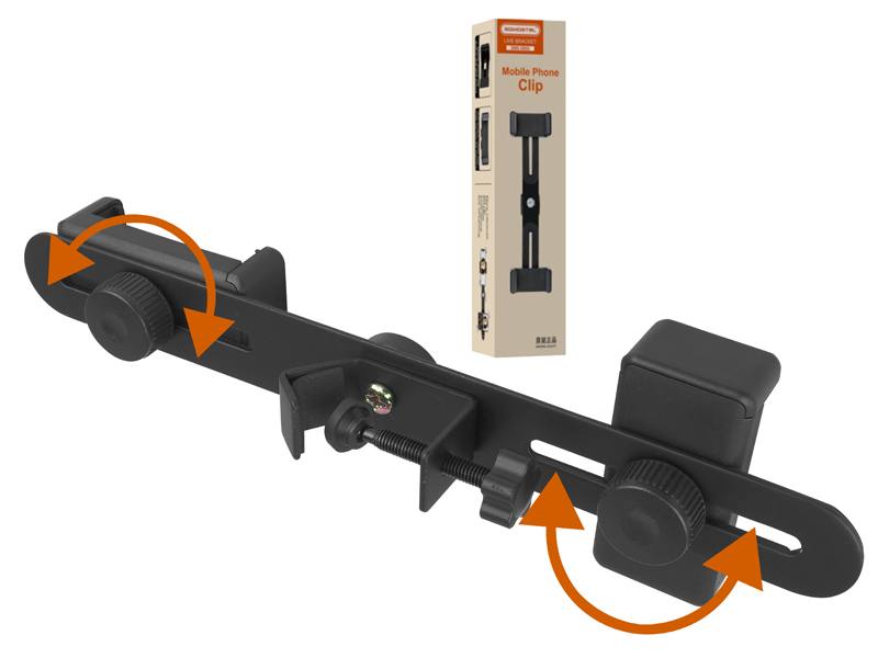 Uniwersalne mocowanie służące do montażu dwóch telefonów komórkowych obok siebie. Wsparcie dla gwintu 1/4" pozwala zamontować uchwyt na większości statywów. Alternatywnie, regulowany chwytak pozwala na mocowanie do dowolnej powierzchni. Uchwyty telefonów można przesuwać w poziomie, pozwalają na montaż telefonu w orientacji pionowej i poziomej.