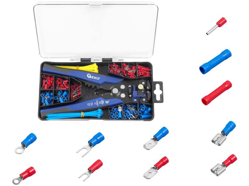 Wielofunkcyjny ściągacz izolacji + zestaw konektorów i opasek 260el. Geko G01776.